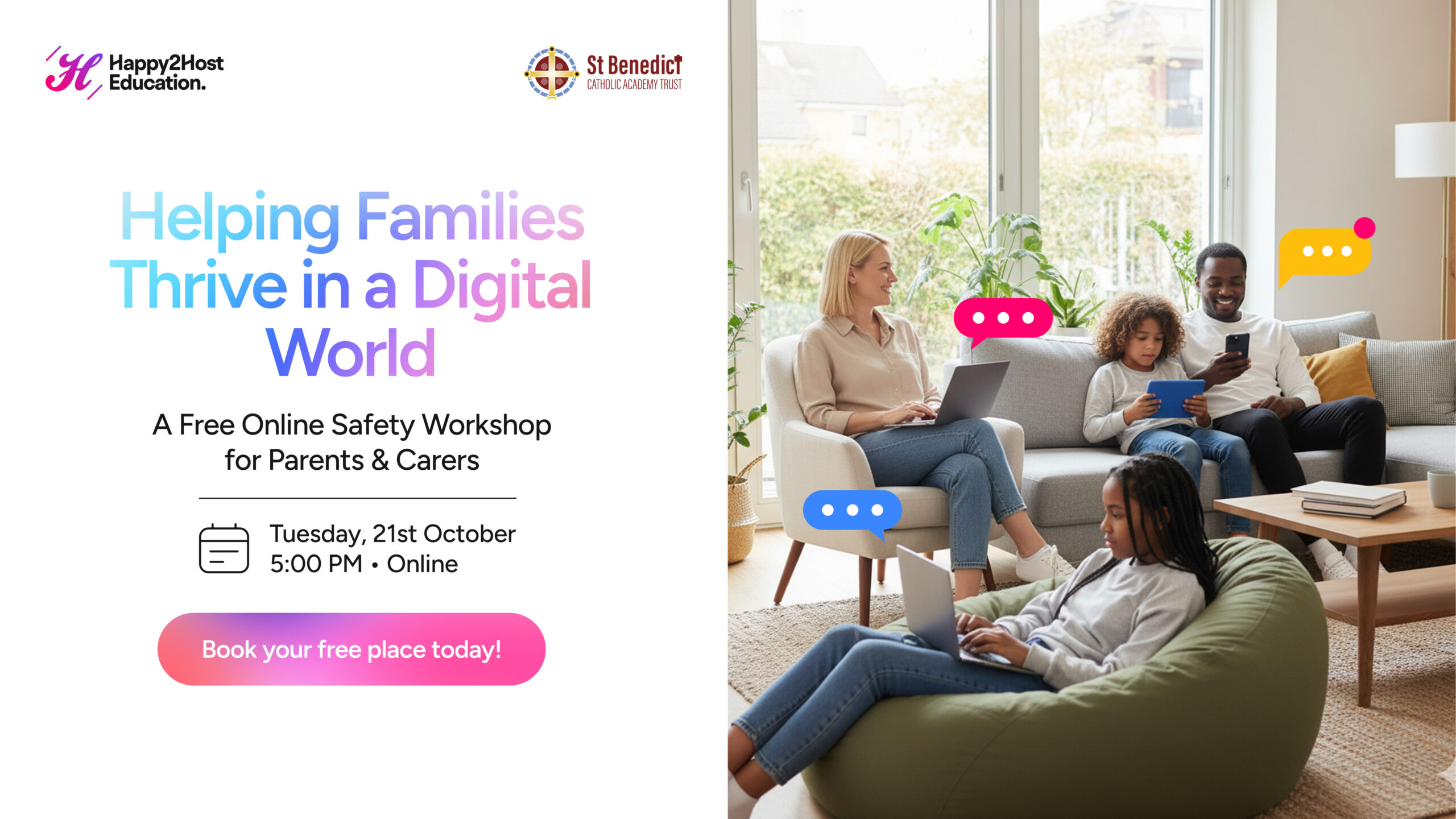 Join the St Benedict Trust for an essential workshop designed for primary and secondary school parents and carers. In 45 minutes, we will provide the confidence and tools to support your child’s healthy and safe relationship with technology.